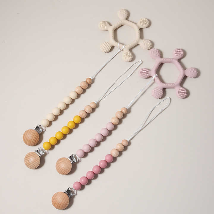 Catenella: Realizzata con perline in legno naturale e silicone di alta qualità, la catenella è morbida al tatto e sicura per il bambino. Il morsetto in legno permette di agganciarla facilmente al passeggino, al seggiolino auto o ai vestiti del bambino, mantenendo sempre a portata di mano il ciuccio.