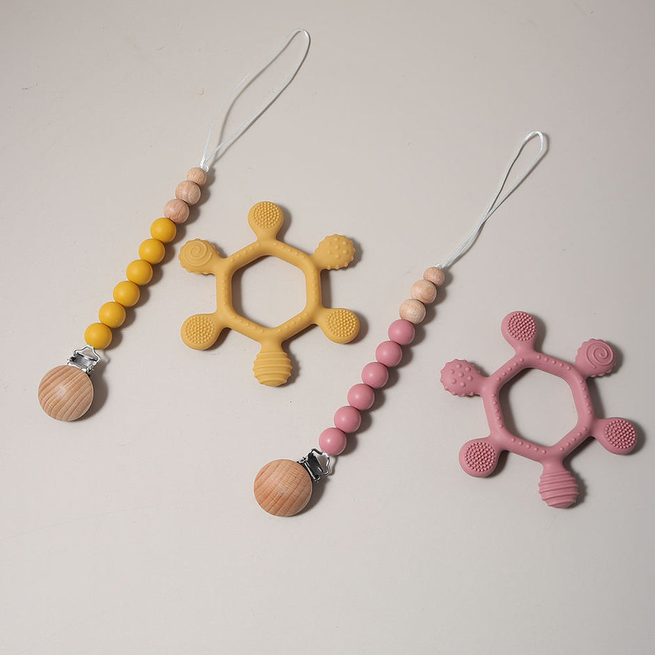Questa adorabile combinazione unisce la praticità di una catenella portaciuccio alla funzionalità di un gioco per la dentizione.